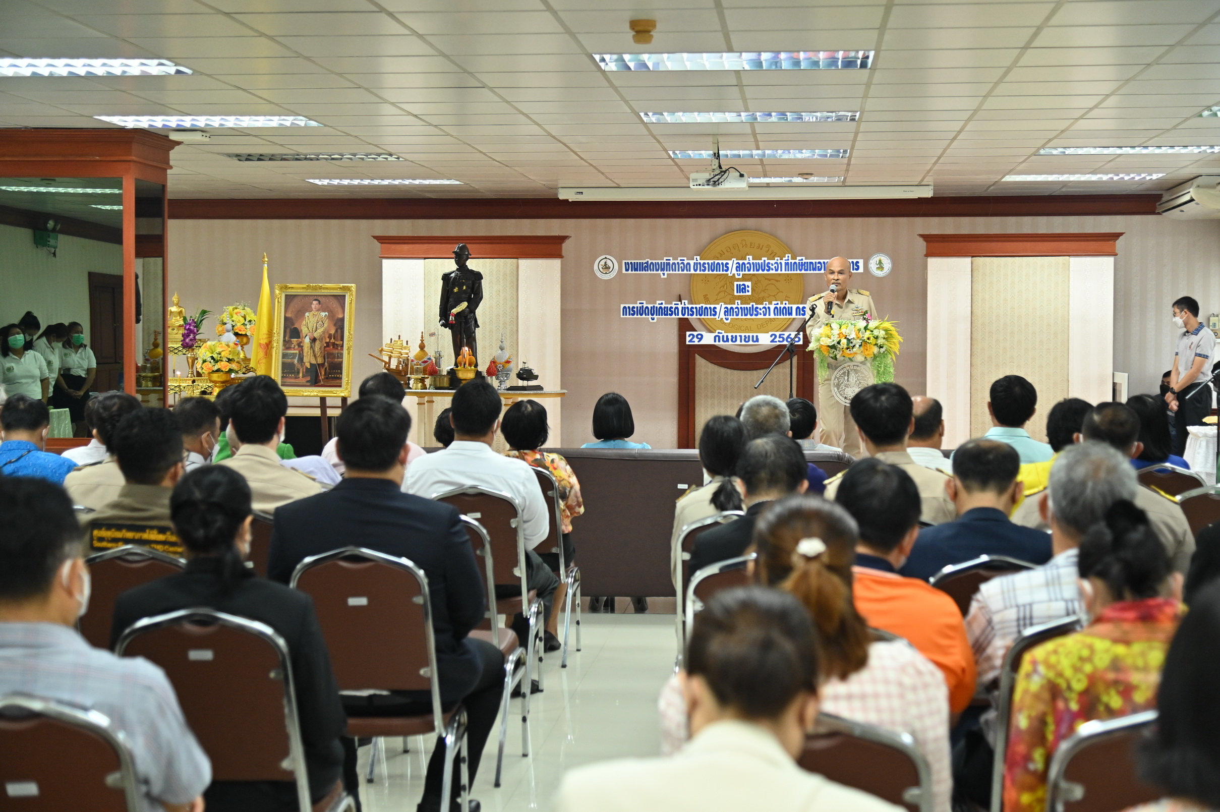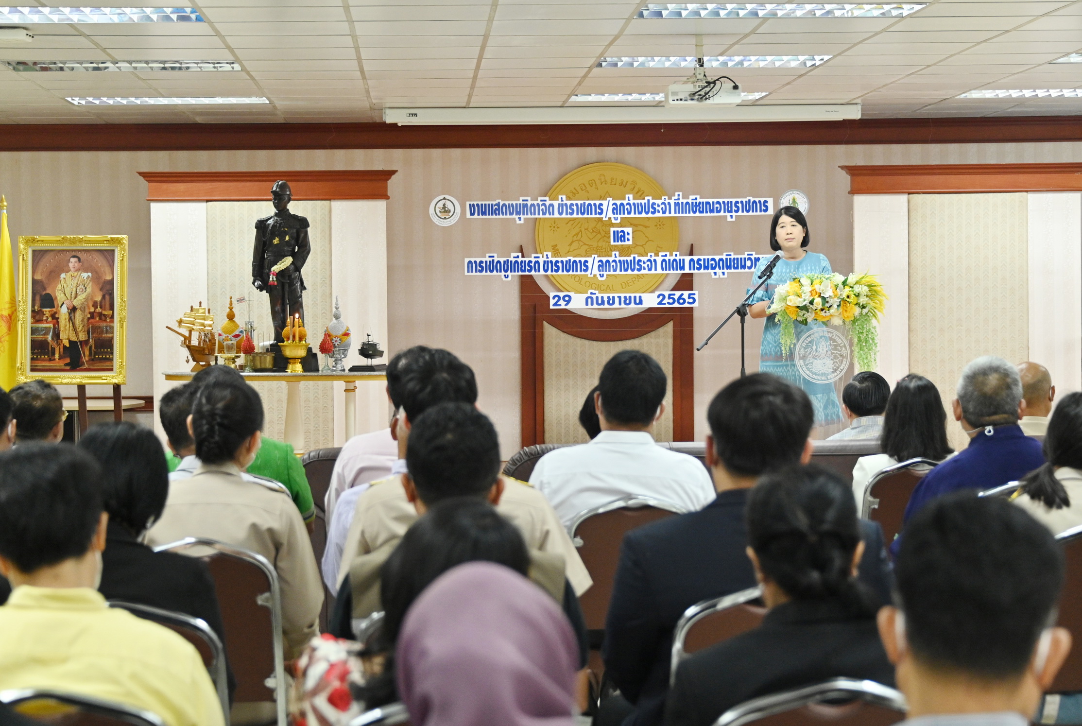 วันนี้ (29 กันยายน 2565) เวลา 09.00 น. ดร. ชมภารี ชมภูรัตน์ อธิบดีกรมอุตุนิยมวิทยา เป็นประธานในงานแสดงมุทิตาจิตข้าราชการ ลูกจ้างประจำที่เกษียณอายุ และการเชิดชูเกียรติแก่ข้าราชการ ลูกจ้างประจำดีเด่น ของกรมอุตุนิยมวิทยา ประจำปี 2565 มี ว่าที่ร้อยตรี ธนะสิทธิ์ เอี่ยมอนันชัย รองอธิบดีฝ่ายวิชาการ กล่าวรายงาน โดยในปีงบประมาณ พ.ศ. 2565 กรมอุตุนิยมวิทยามีข้าราชการเกษียณอายุราชการ จำนวน 33 คน และลูกจ้างประจำ จำนวน 7 คน รวมทั้งสิ้น 40 คน นอกจากนี้ ยังมีผู้เข้ารับเกียรติบัตรข้าราชการดีเด่น จำนวน 14 คน เข้าร่วมพิธี ณ ห้องเขตอุดมศักดิ์ ชั้น 13 อาคาร 50 ปี อุตุนิยมวิทยา