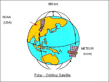 2. ชนิดวงโคจรผ่านใกล้ขั้วโลก ( Near Polar Orbiting Meteorological Satellite )โคจรผ่านใกล้ขั้วโลกเหนือและใต้ มีความสูงจากพื้นโลกประมาณ 850 กิโลเมตร โคจรรอบโลกประมาณ 102 นาที ต่อ 1 รอบ ในหนึ่งวันจะหมุนรอบโลกประมาณ 14 รอบ และจะเคลื่อนที่ผ่านเส้นศูนย์สูตรในเวลาเดิม (ตามเวลาท้องถิ่น) 2 ครั้ง โดยโคจรเคลื่อนที่จากขั้วโลกเหนือไปยังขั้วโลกใต้ 1 ครั้ง และโคจรเคลื่อนที่จากขั้วโลกใต้ไปยังขั้วโลกเหนืออีก 1 ครั้ง การถ่ายภาพของดาวเทียมชนิดนี้ จะถ่ายภาพและส่งสัญญาณข้อมูลสู่ภาคพื้นดินในเวลาจริง ( Real Time ) ในขณะที่ดาวเทียมโคจรผ่านพื้นที่นั้น ๆ โดยมี Track ความกว้าง 2,700 กิโลเมตร