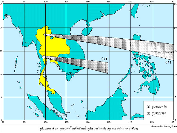 รูปแบบหลักในระยะครึ่งแรกของเดือนมีแหล่งกำเนิดในทะเลจีนใต้ตอนบนเคลื่อนขึ้นฝั่งประเทศเวียดนามผ่านลาว เข้าสู่ภาคตะวันออกเฉียงเหนือตอนบน และภาคเหนือของประเทศไทย ส่วนรูปแบบรองมีแหล่งกำเนิดในมหาสมุทรแปซิฟิกเคลื่อนผ่านประเทศฟิลิปปินส์ ทะเลจีนใต้ เกาะไหหลำ อ่าวตังเกี๋ย ประเทศเวียดนามตอนบน และลาวเข้าสู่ประเทศไทยทางภาคเหนือตอนบน ส่วนครึ่งหลังของเดือนรูปแบบหลักมีแหล่งกำเนิดในทะเลจีนใต้ตอนกลาง เคลื่อนขึ้นฝั่งประเทศเวียดนามผ่านลาวเข้าสู่ประเทศไทยทางภาคตะวันออกเฉียงเหนือตอนล่าง แล้วจึงเข้าสู่ภาคกลาง ส่วนรูปแบบรองมีแหล่งกำเนิดในมหาสมุทรแปซิฟิกเคลื่อนผ่านประเทศฟิลิปปินส์ ทะเลจีนใต้ประเทศเวียดนาม และลาวเข้าสู่ภาคตะวันออกเฉียงเหนือและภาคเหนือของประเทศไทย