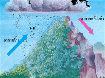 และบริเวณใดมีฝนน้อยบริเวณที่มีฝนมาก มักเป็นบริเวณที่อยู่ด้านหน้าภูเขาหรือที่เรียกว่าเป็นด้านรับลม เช่น ในช่วงฤดูฝนซึ่งมรสุมตะวันตกเฉียงใต้พัดปกคลุมประเทศไทย มรสุมนี้จะพัดพาความชื้นจากทะเลมาปะทะแนวเขา อากาศชื้นจะยกตัวขึ้นตามลาดเขา และกลั่นตัวเป็นเมฆและฝนด้านหน้าเขา ส่วนด้านหลังเขาซึ่งเป็นด้านปลายลม จะมีฝนน้อยกว่า ตัวอย่างเช่น บริเวณที่เป็นด้านรับลมหน้าทิวเขาถนนธงชัยและทิวเขาตะนาวศรี ได้แก่ พื้นที่บริเวณด้านตะวันตกของจังหวัดตากและกาญจนบุรีจะมีฝนมาก และพื้นที่ซึ่งเป็นด้านปลายลมหลังทิวเขาตะนาวศรี ได้แก่ บริเวณจังหวัดเพชรบุรีและประจวบคีรีขันธ์จะมีฝนน้อย