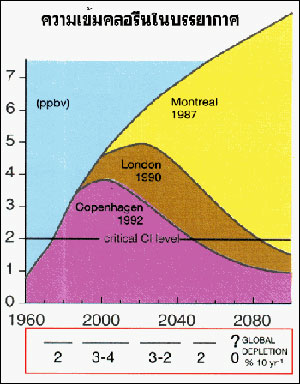 รูปที่ 20 การตรวจวัดสมดุลคลอรีนในบรรยากาศนับแต่ปี ค.ศ.1960 และการทำนายเนื่องจากการลดเลิกใช้สารซีเอฟซีและสารทำลายโอโซนต่างๆ ตัวเลขข้างล่างชี้การลดลงของโอโซนต่อสิบปี หากพิธีสารมอนทรีออลประสบความสำเร็จ
