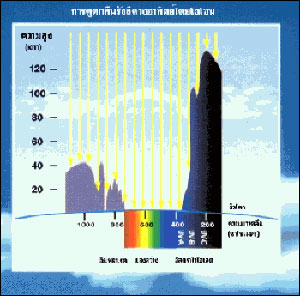 รังสีอัลตราไวโอเลตไม่ส่องถึงพื้นที่ช่วงคลื่น UV-B (320 นาโนเมตร) เนื่องจากมีโอโซนดูดกลืน ดังรูป
