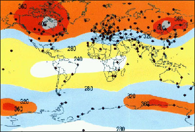 รูปที่ 2 ที่ตั้งของสถานีตรวจวัดโอโซนทั่วโลก นำมาซึ่งค่าเฉลี่ยและการกระจายโอโซน โดยมีค่าต่ำในเขตศูนย์สูตรและมีค่าสูงในละติจูดกลางและขั้วโลก สำหรับประเทศไทยมีค่าเฉลี่ยรายปี 240-280 หน่วยด็อบสัน