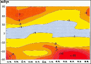 รูปที่ 14แสดงความเปลี่ยนแปลงตลอดปี ระหว่างโอโซนเฉลี่ยในปี 1964-1980 และ 1984-1993 ชัดเจนว่าบริเวณขั้วโลกลดลงมากถึงร้อยละ 35 ในเดือนตุลาคมเหนือขั้วโลกใต้ ในละติจูดกลางและขั้วโลกเหนือ(ในฤดูหนาว-ใบไม้ผลิ) ลดลงร้อยละ 7 ส่วนเขตศูนย์สูตร (รวมทั้งประเทศไทย) ไม่มีความเปลี่ยนแปลง