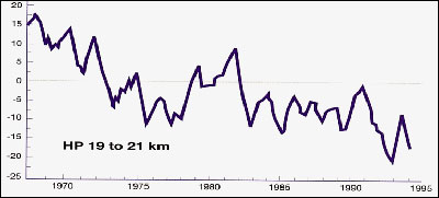 โอโซนตามความสูง ลดลงมากสุดที่ชั้นสตราโตสเฟียร์ตอนล่าง จากการหยั่งอากาศที่เมือง Hohenpeissenberg ประเทศเยอรมัน แสดงโอโซนเป็นความกด(partial pressure) ที่ความสูง 19-21 กิโลเมตร ลดลง 30 นาโนบาร์ (nb) หรือประมาณร้อยละ 20 ของเทียบกับ 25 ปีก่อน ดังรูปที่ 15