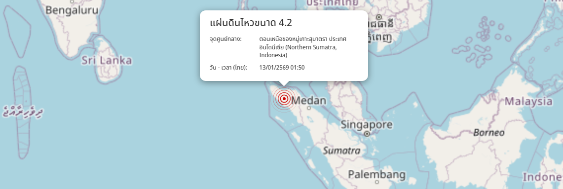 แผ่นดินไหว ตอนเหนือของหมู่เกาะสุมาตรา ประเทศอินโดนีเซีย (Northern Sumatra, Indonesia) ขนาด 4.2
