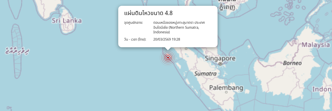 แผ่นดินไหว ตอนเหนือของหมู่เกาะสุมาตรา ประเทศอินโดนีเซีย (Northern Sumatra, Indonesia) ขนาด 4.8